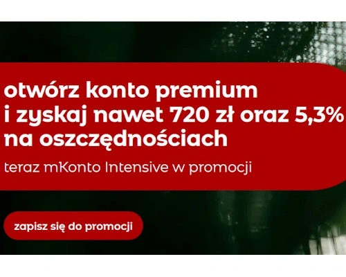 mKonto Intensive w mBanku to konto premium stworzone dla osób, które oczekują więcej od codziennej bankowości i chcą korzystać z dodatkowych przywilejów. W promocji możesz zyskać nawet do 720 zł premii za aktywne korzystanie z konta oraz skorzystać z atrakcyjnego oprocentowania na rachunku oszczędnościowym „Moje cele” na poziomie 5,3% w skali roku. To dobre rozwiązanie dla osób, które chcą nie tylko zarządzać finansami, ale także efektywnie oszczędzać.